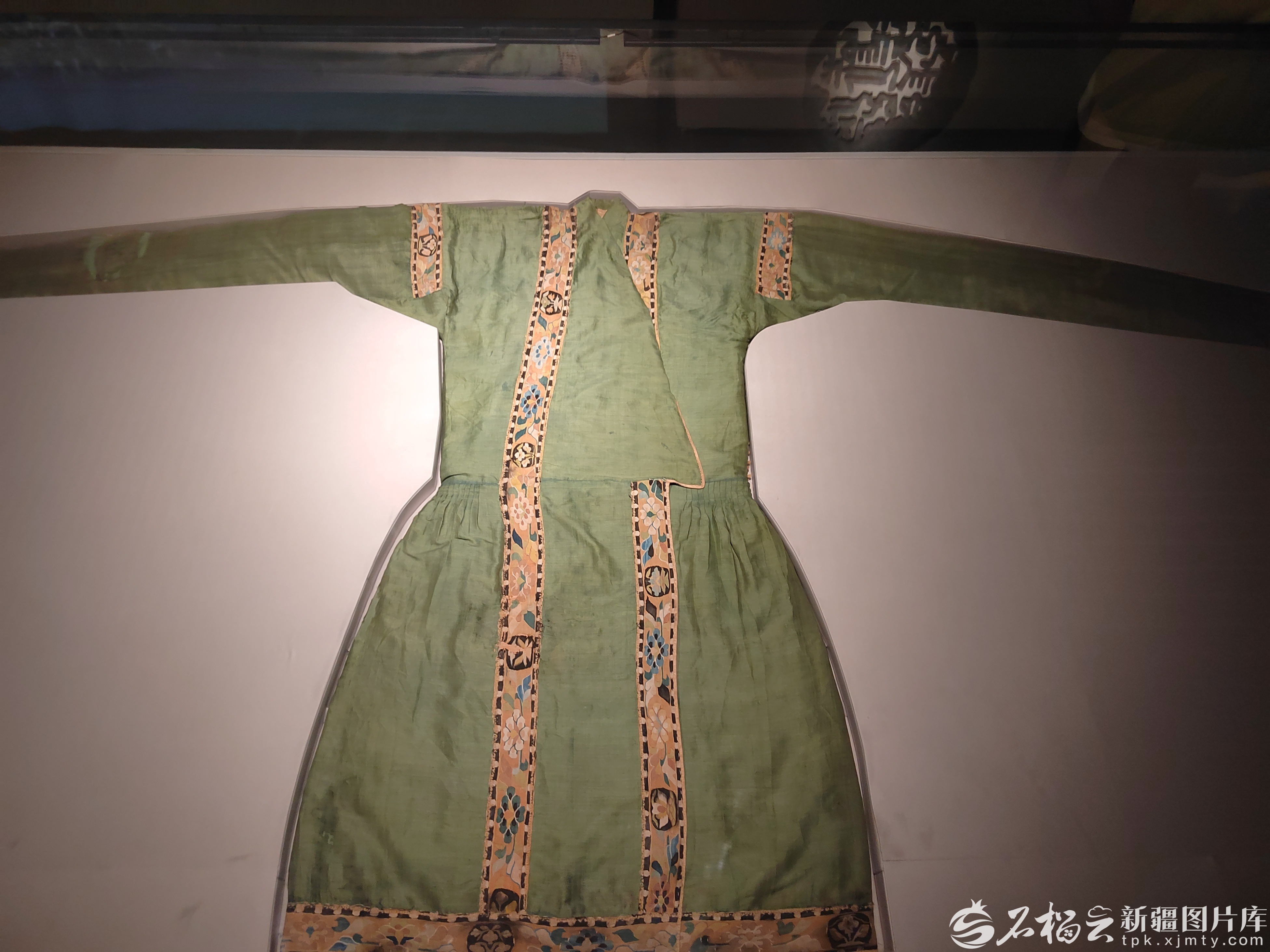 这件棉袍是国家一级文物,征集自新疆麦盖提县,穿越千年,气度依然。其色彩淡雅,以青色绢为面,黄色棉布为里。其形制修长,袍身长达1.25米,通袖更达2.85米,采用开襟交领、窄袖掐腰、下摆宽大的设计,整体端庄大气,又融入了浓郁的边塞风情。