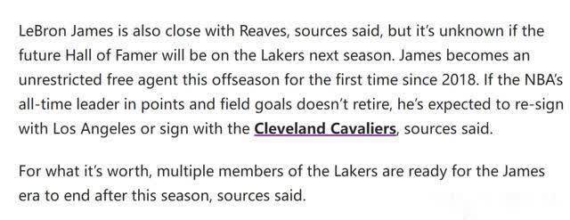Ashish Mathur在报道中透露,多位湖人球员和管理层已经做好准备,在今年夏天迎接詹姆斯时代的终结。今年夏天,里夫斯跳出合同成为自由球员,詹姆斯的合同届时也将到期,湖人管理层很难同时留下他俩。