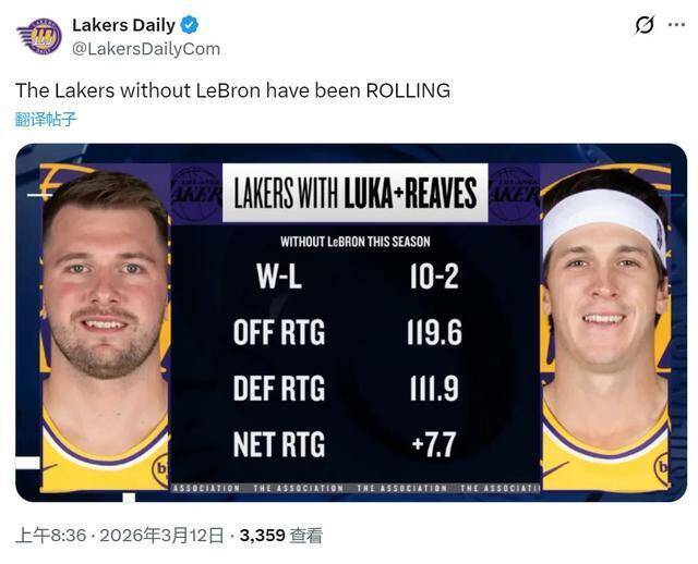 Lakers Daily又晒出一组数据:本赛季当詹姆斯缺席,东契奇和里夫斯同时出战,湖人10胜2负,胜率高达83.3%。这12场比赛,湖人进攻效率119.6,高居联盟第三;防守效率111.9,联盟第六;净效率+7.7,同样是联盟第三。
