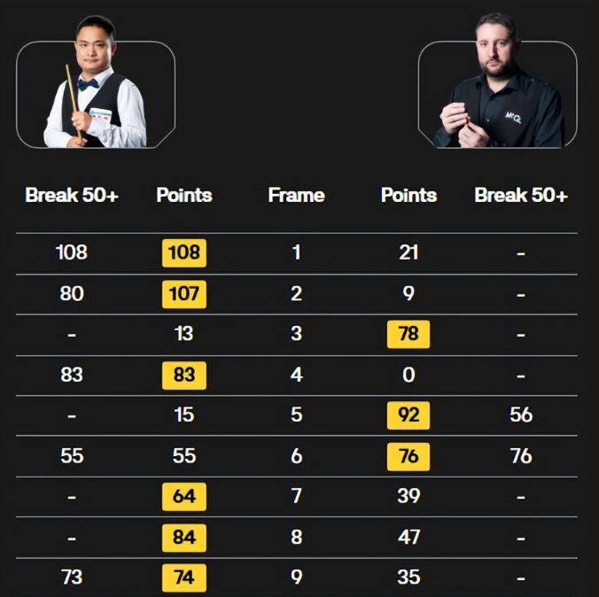 根据赛后统计,许医尘全场打出了一杆破百(108分)和六杆50+(80分、83分、55分、73分、75分、94分),进攻火力全面压制了对手。