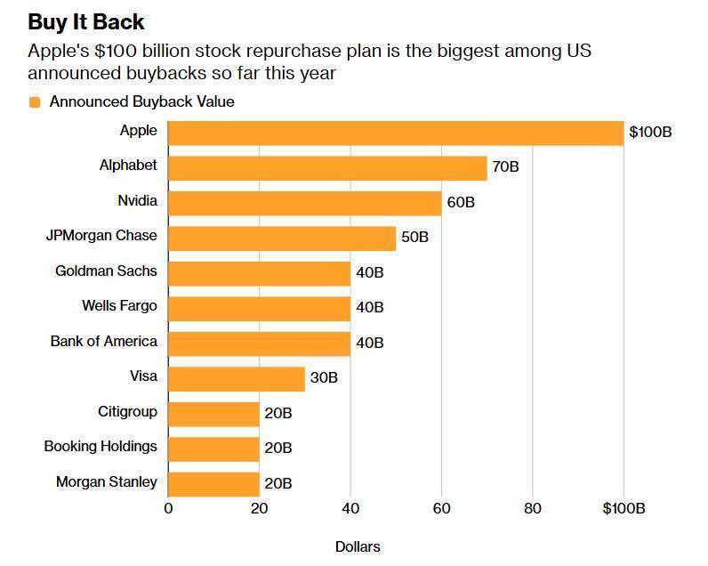 今年5月,苹果公司(AAPL)宣布将回购1000亿美元股票。Alphabet(GOOGL)、摩根大通(JPM)、高盛集团(GS)、富国银行(WFC)和美国银行(BAC)也宣布了至少400亿美元的回购计划。