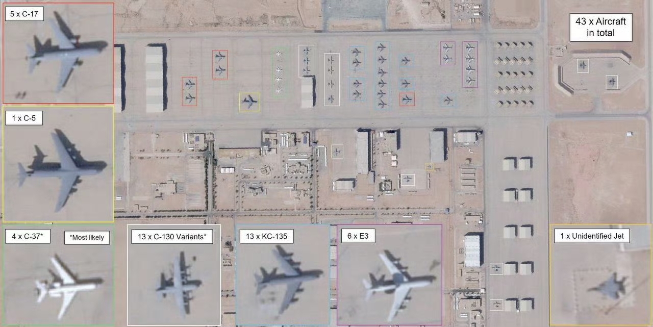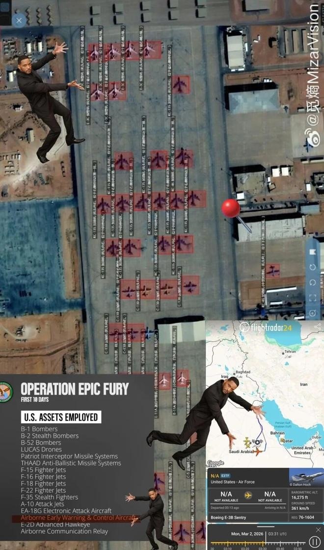 梳理近期战事脉络,美军加油机损失并非孤立事件。3月12日,两架美军KC-135空中加油机发生事故,其中一架坠毁、6名机组人员全部身亡,另一架安全降落但尾部受损,这也是此次冲突中美军首次出现大型军机坠毁并伴随人员死亡的情况。MizarVision发布的卫星图像显示,苏丹王子空军基地停机坪特定区域遭导弹精准命中,该基地原本停满美军作战飞机,此次打击直接暴露了美军前沿部署基地的防御漏洞。