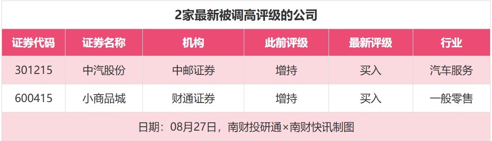 评级调高方面,8月27日,券商调高上市公司评级达到2家次,最新数据包括了中邮证券对中汽股份的评级从“增持”调高至“买入”,财通证券对小商品城的评级从“增持”调高至“买入”。