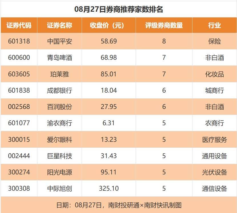 从券商推荐家数来看,8月27日有307家上市公司得到券商推荐,其中中国平安获得8家推荐,青岛啤酒获得7家推荐,珀莱雅获得7家推荐。