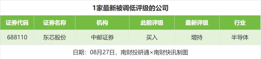 评级调低方面,8月27日,券商调低上市公司评级达到1家次,最新数据包括了中邮证券对东芯股份的评级从“买入”调低至“增持”。