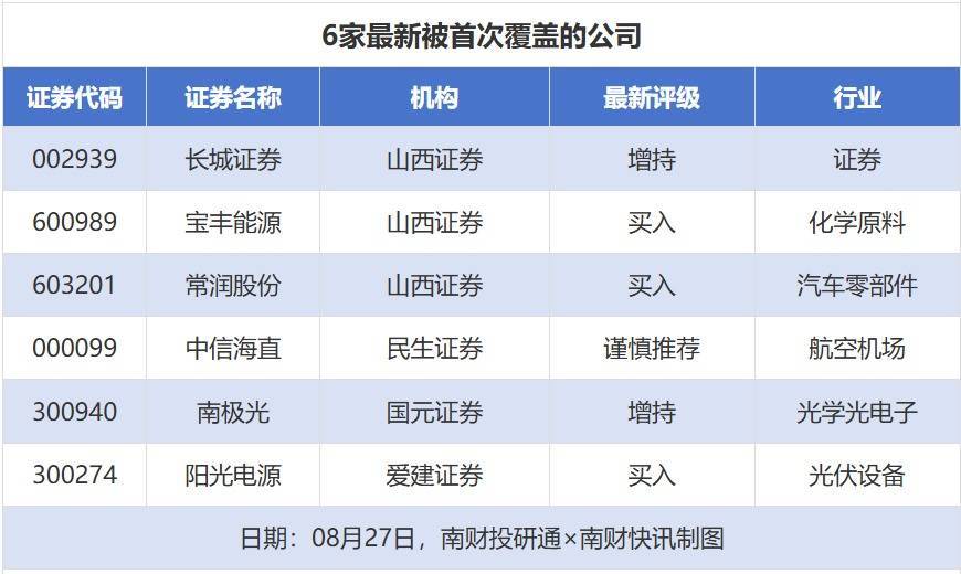 首次覆盖方面,8月27日券商共给出了6次首次覆盖,其中长城证券、宝丰能源、常润股份获得山西证券分别给予“增持”“买入”“买入”评级,中信海直获得民生证券给予“谨慎推荐”评级,南极光获得国元证券给予“增持”评级。