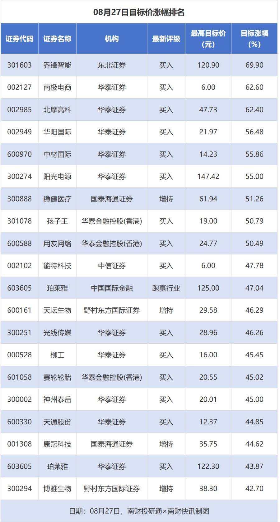 南财投研通数据显示,8月27日,券商给予上市公司目标价共201次配资专业网上配资,按最新收盘价计算,目标价涨幅排名居前的公司有乔锋智能、南极电商、北摩高科,目标价涨幅分别为69.90%、62.60%、62.40%,分别属于通用设备、互联网电商、航空装备行业。